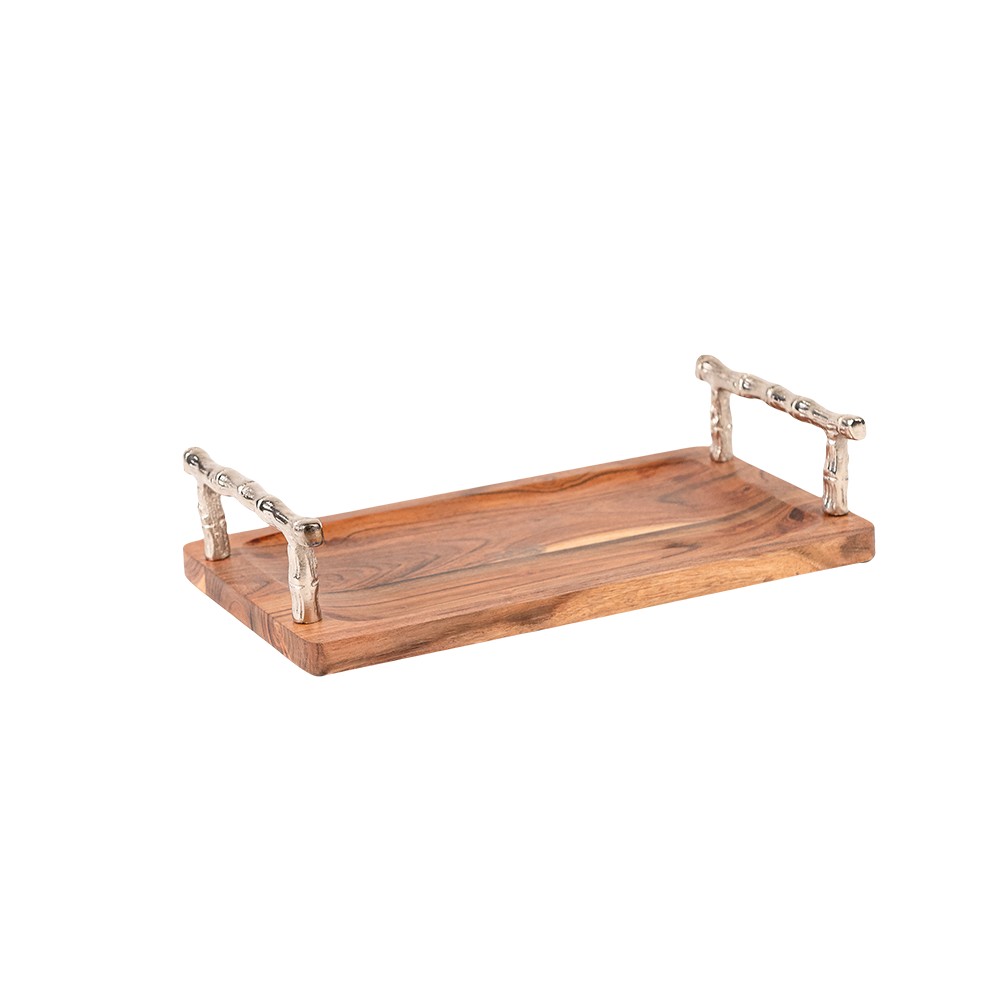 A bandeja é feita de madeira nobre e maciça, com uma textura e veios naturais que a tornam exclusiva. As alças são de metal com banho de níquel, apresentando um design que imita galhos ou chifres, o que cria um contraste visual marcante e um toque de modernidade.