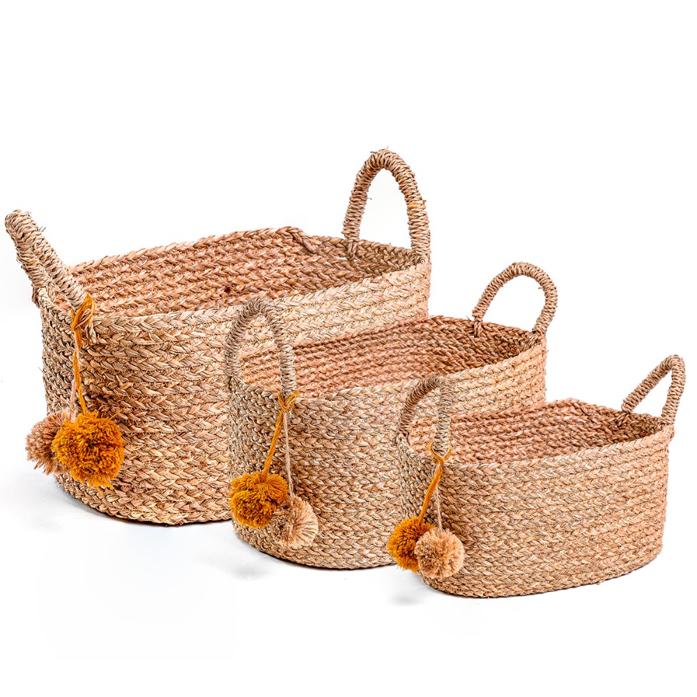 Feito de fibra natural trançada manualmente, um material leve e resistente. As alças e os charmosos pompoms decorativos são confeccionados do mesmo material, o que garante a coesão do design e um visual autêntico e descontraído.