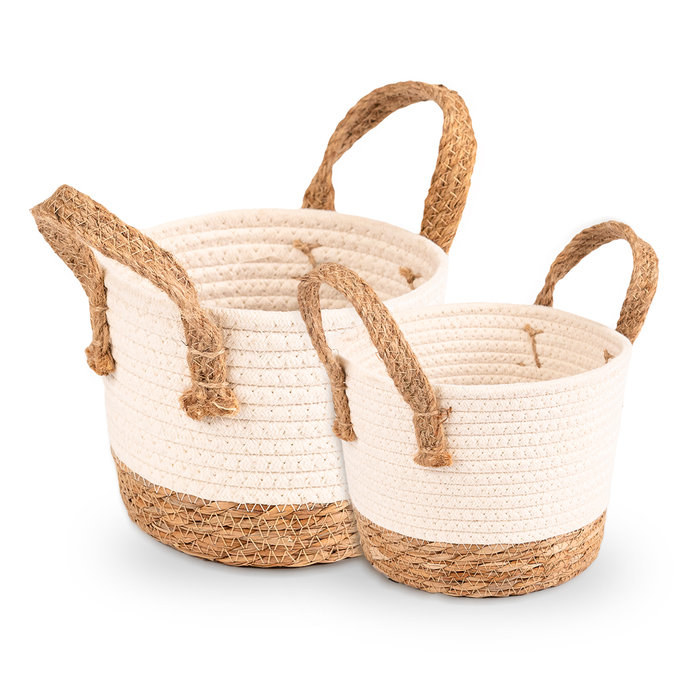 Confeccionado com a parte superior em corda de algodão trançada, o que confere um visual macio e aconchegante. A parte inferior e as alças são de fibra natural, criando um contraste visual interessante e um toque rústico. A combinação dos materiais proporciona durabilidade e um charme único.