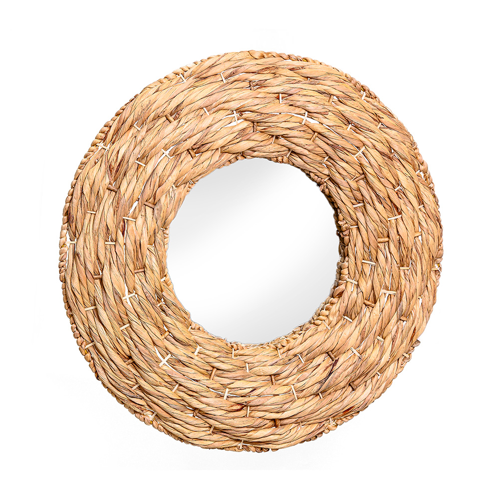 A moldura é feita com fibra natural trançada manualmente, criando uma espessura robusta e um padrão em espiral que se destaca. O material, por ser natural, é sustentável e confere um visual único, com pequenas variações que o tornam ainda mais especial.