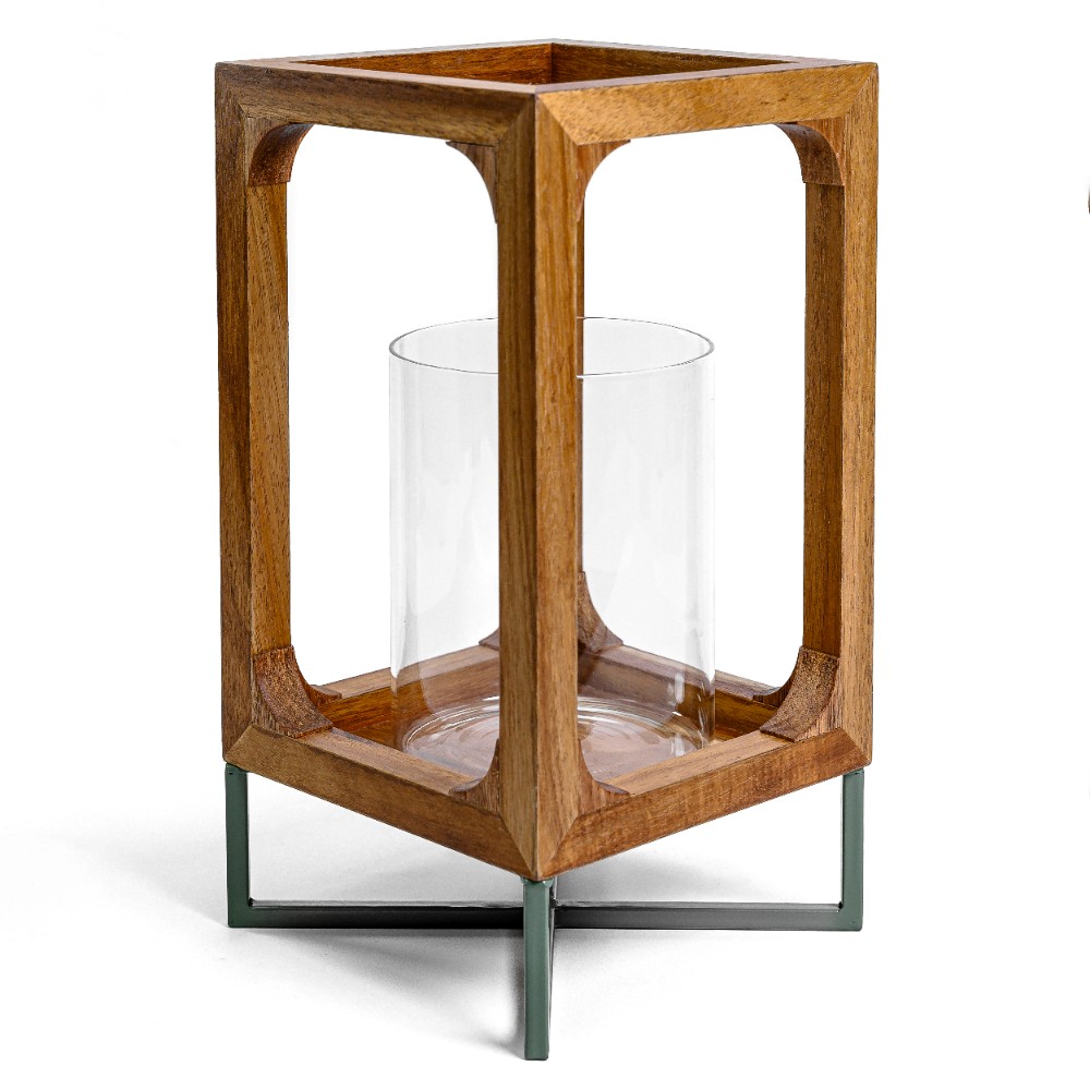 A estrutura superior é feita de madeira nobre, cuidadosamente esculpida para criar uma moldura quadrada com arcos laterais. A base é de metal com pintura preta, em formato de X, garantindo estabilidade e um toque industrial. No centro, um vaso de vidro transparente é encaixado, pronto para acomodar velas ou arranjos.