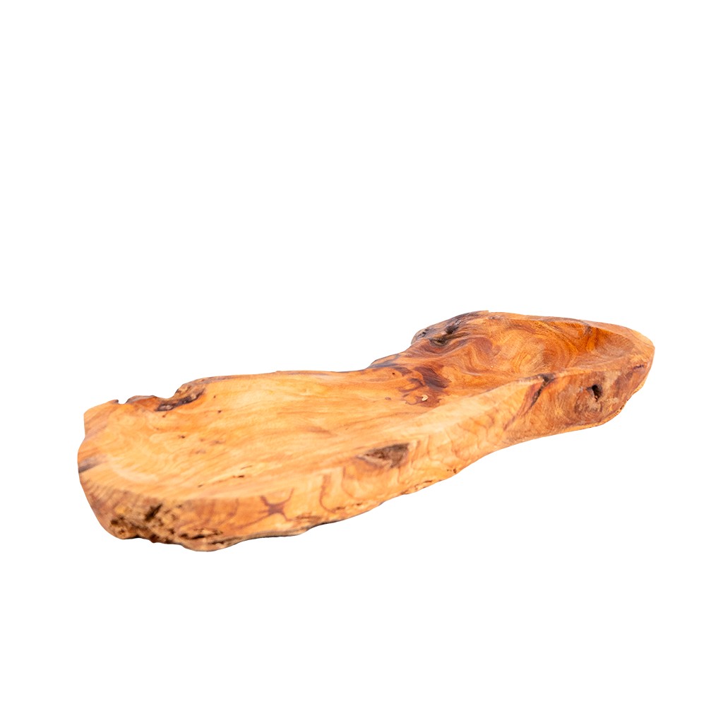 Confeccionada em madeira de oliveira maciça, esta peça é valorizada por sua durabilidade e, principalmente, pelos seus veios ricos e contrastantes, que contam a história da árvore. O acabamento realça o aspecto rústico e natural do tronco, garantindo que não existam duas peças idênticas.
