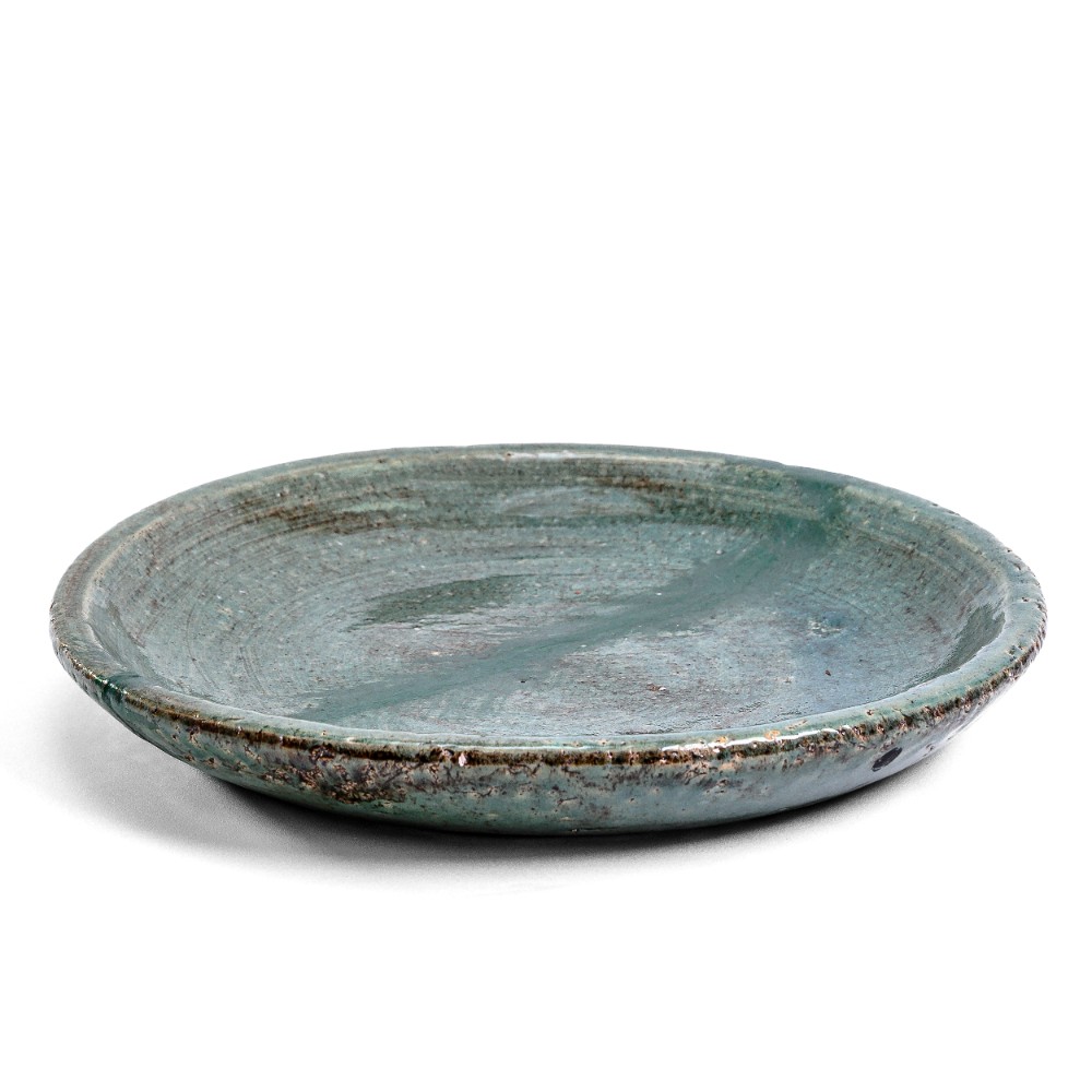 Confeccionado em cerâmica, o prato tem um acabamento em esmalte com efeito rústico e artesanal, que confere uma textura única e uma tonalidade de azul-esverdeado vibrante. A borda é mantida em sua forma natural, reforçando a estética orgânica e autêntica da peça.