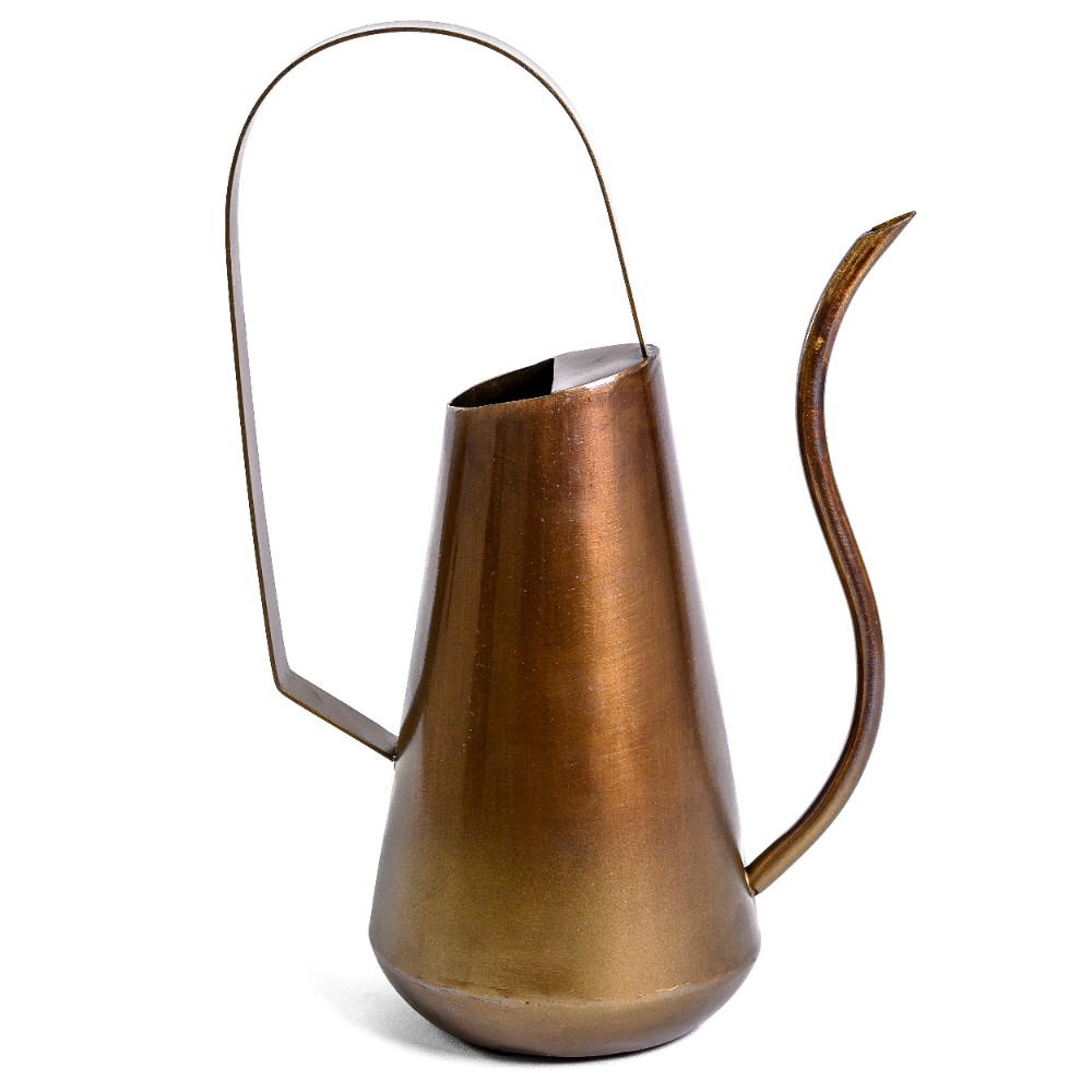 Fabricado em metal com acabamento em tom de cobre envelhecido, o regador tem um visual rústico e sofisticado ao mesmo tempo. A alça fina e o bico sinuoso são feitos do mesmo material, o que garante a durabilidade e a estética coesa da peça.