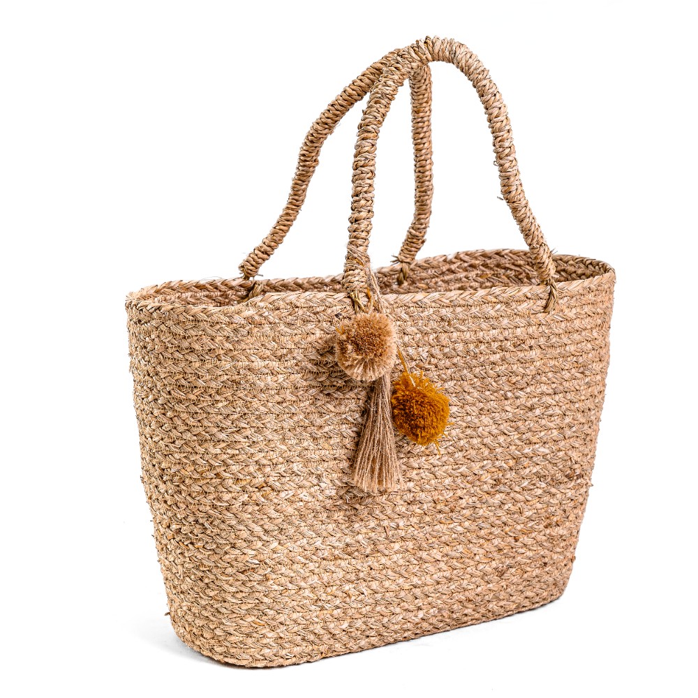 Feita de palha trançada manualmente, um material leve e resistente, perfeito para o verão e para o clima quente. As alças e os charmosos pompoms decorativos são confeccionados do mesmo material, o que garante a coesão do design e um visual autêntico e descontraído.