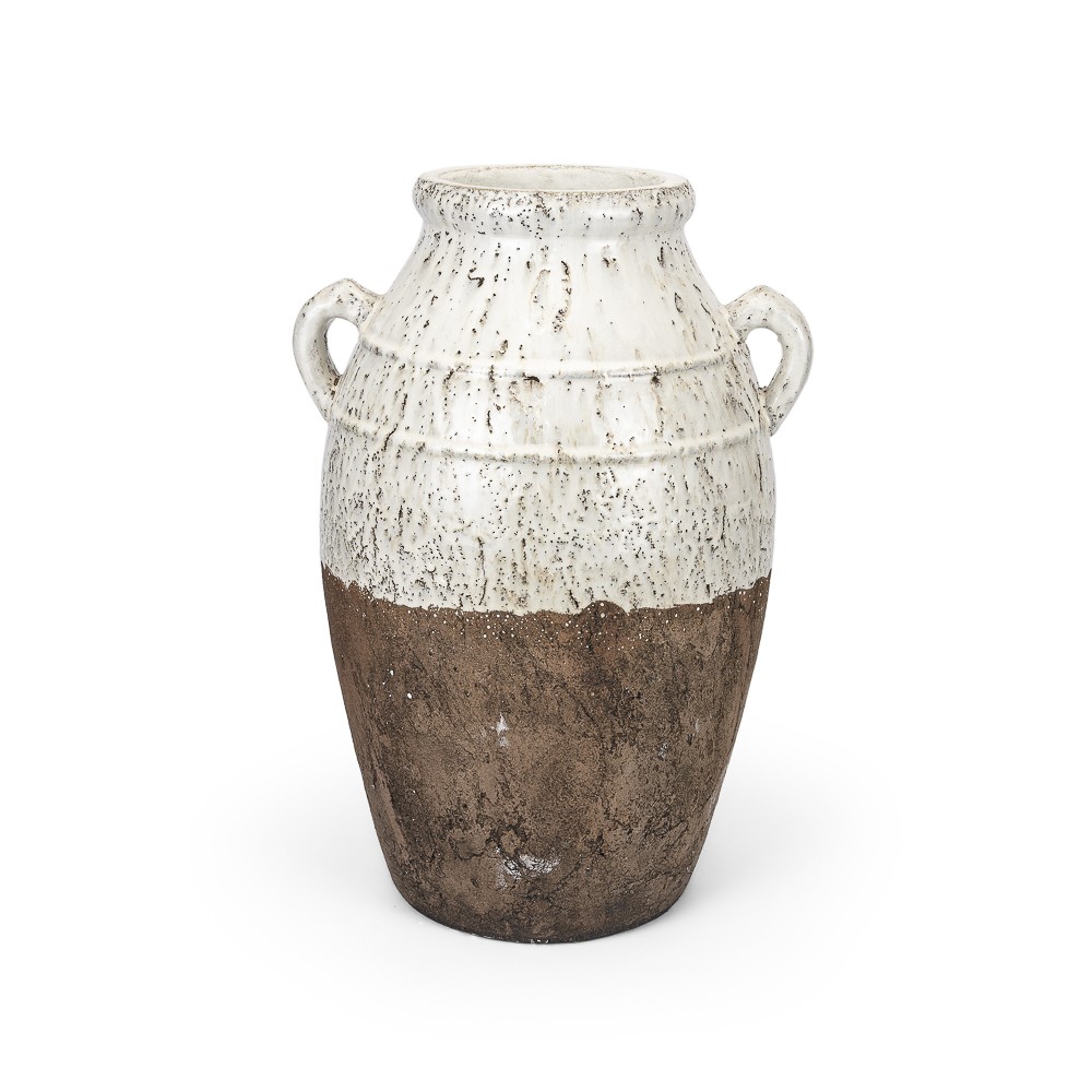 Confeccionado em cerâmica, o vaso tem um acabamento superior em esmalte craquelado em tons de branco e bege, enquanto a parte inferior tem uma textura rústica e terrosa. As alças laterais são feitas do mesmo material e adicionam um charme extra à peça.