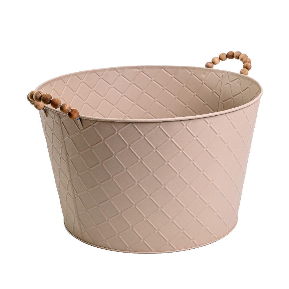 Fabricado em metal com acabamento em pintura fosca, o balde tem um visual rústico e sofisticado ao mesmo tempo. A alça é de metal com contas de madeira natural, que adicionam um toque de aconchego e estilo, facilitando o transporte.