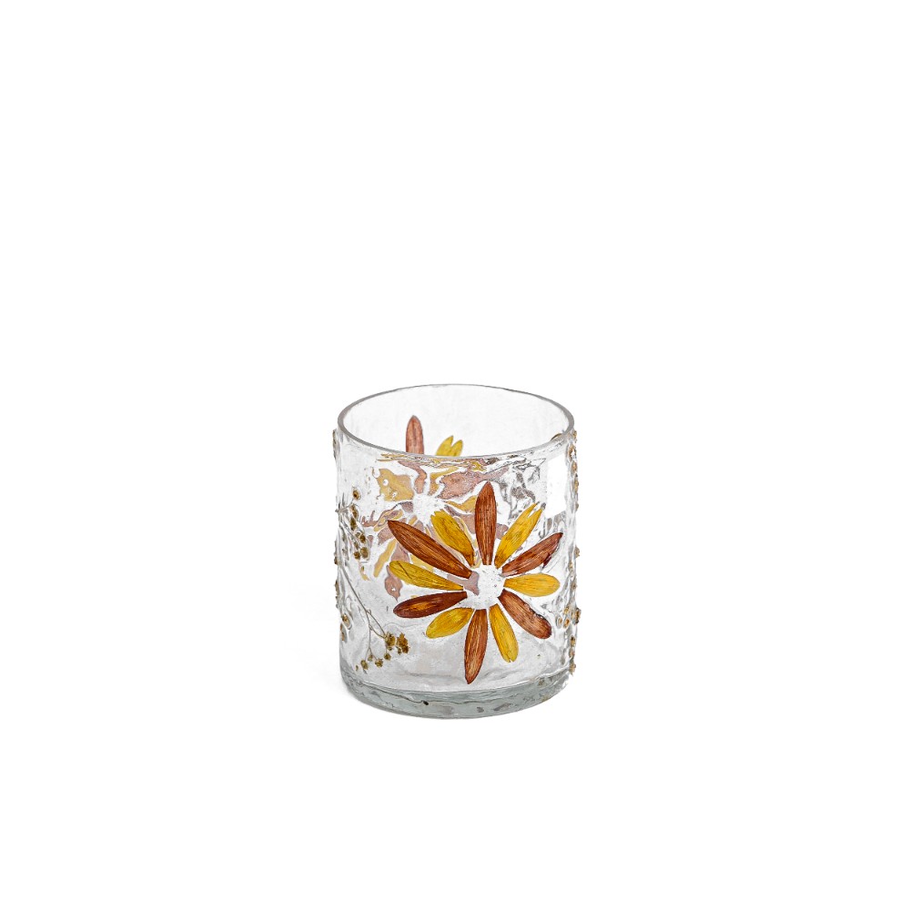 Confeccionado em vidro transparente com flores prensadas no interior, o que cria um visual artesanal e sutil. O corpo do vaso possui uma textura levemente craquelada, adicionando um charme extra à peça. As flores prensadas, em tons terrosos e vibrantes, são naturais, o que confere a cada vaso uma singularidade.